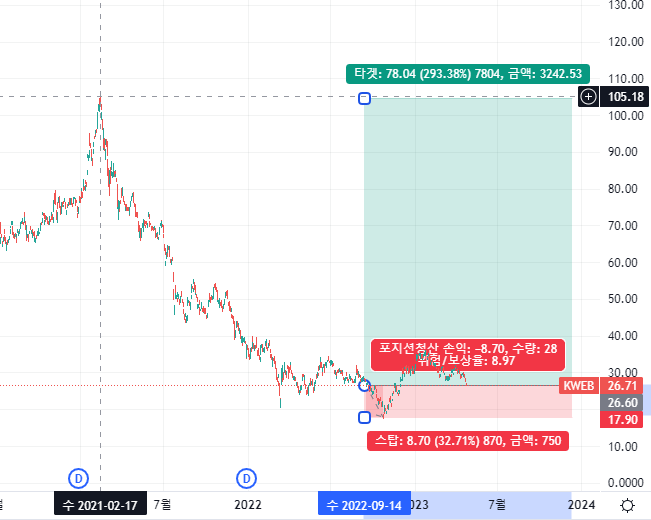 위 차트는 KWEB(중국 ETF)의 가격 변동 그래프입니다.