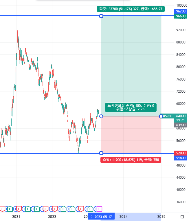 2. '만약에 내 예측이 틀린다면 최근 저점인 51,800원까지 가격 하락이 있을 수 있다.' 이 때의 가격 하락률은 20%입니다. 예측이 틀린다면 주식을 51,800원에 손절을 하는 것이죠.